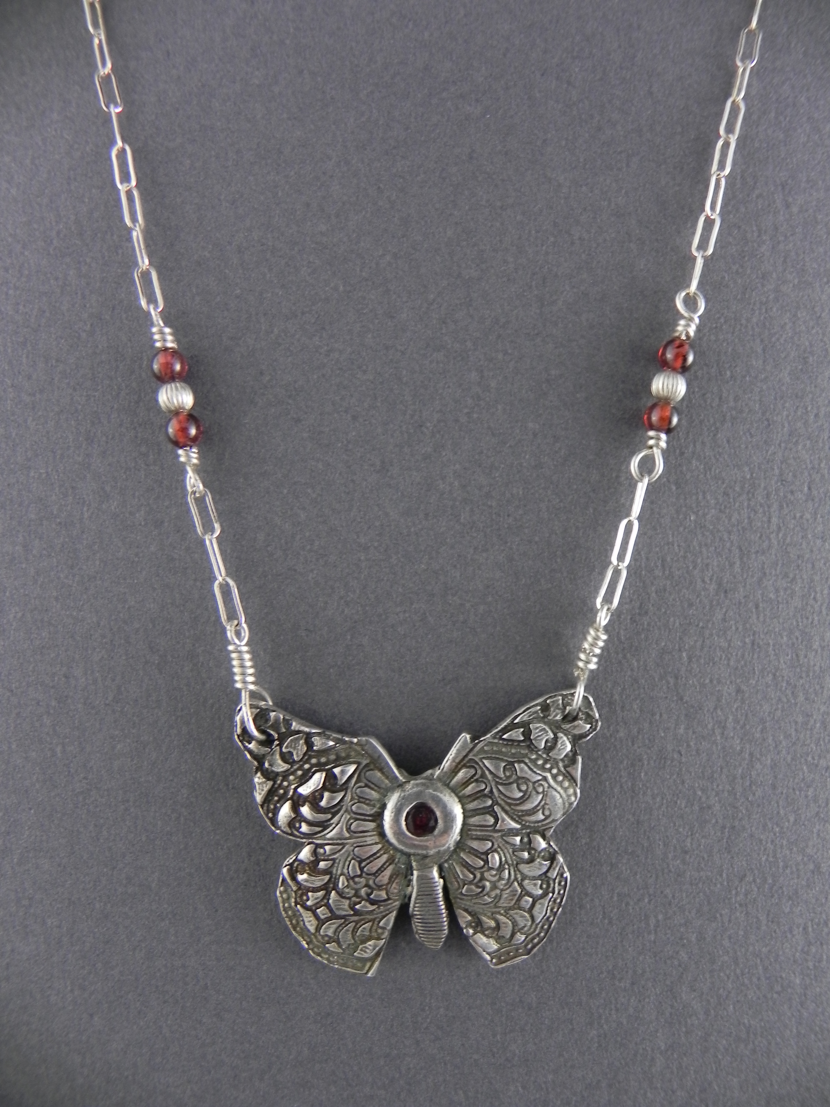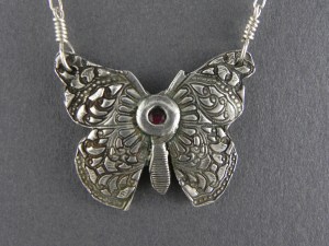 Fine Silver Butterfly Necklace with Red Cubic Zirconia (CZ) & Garnet on Sterling Silver Chain
