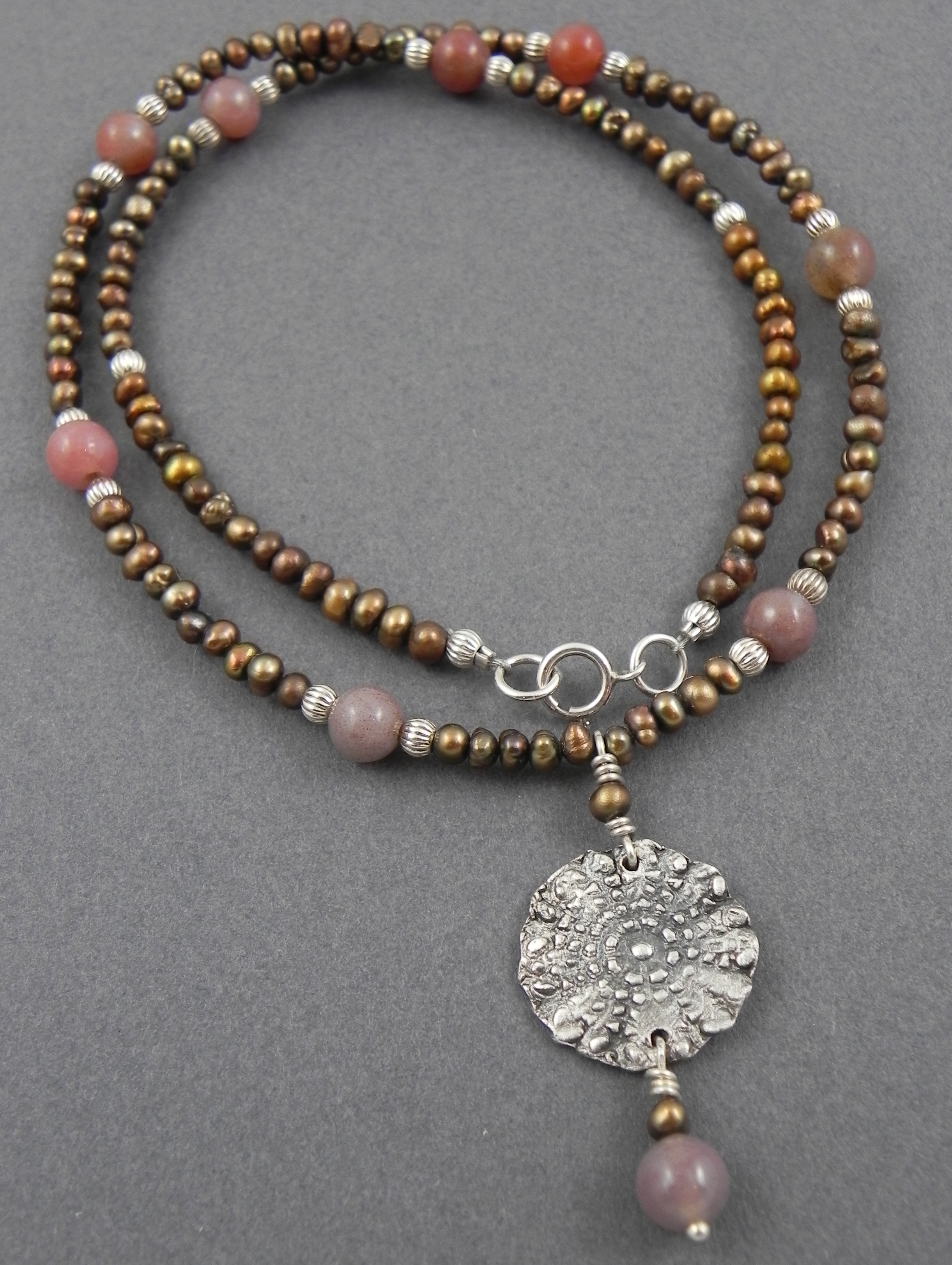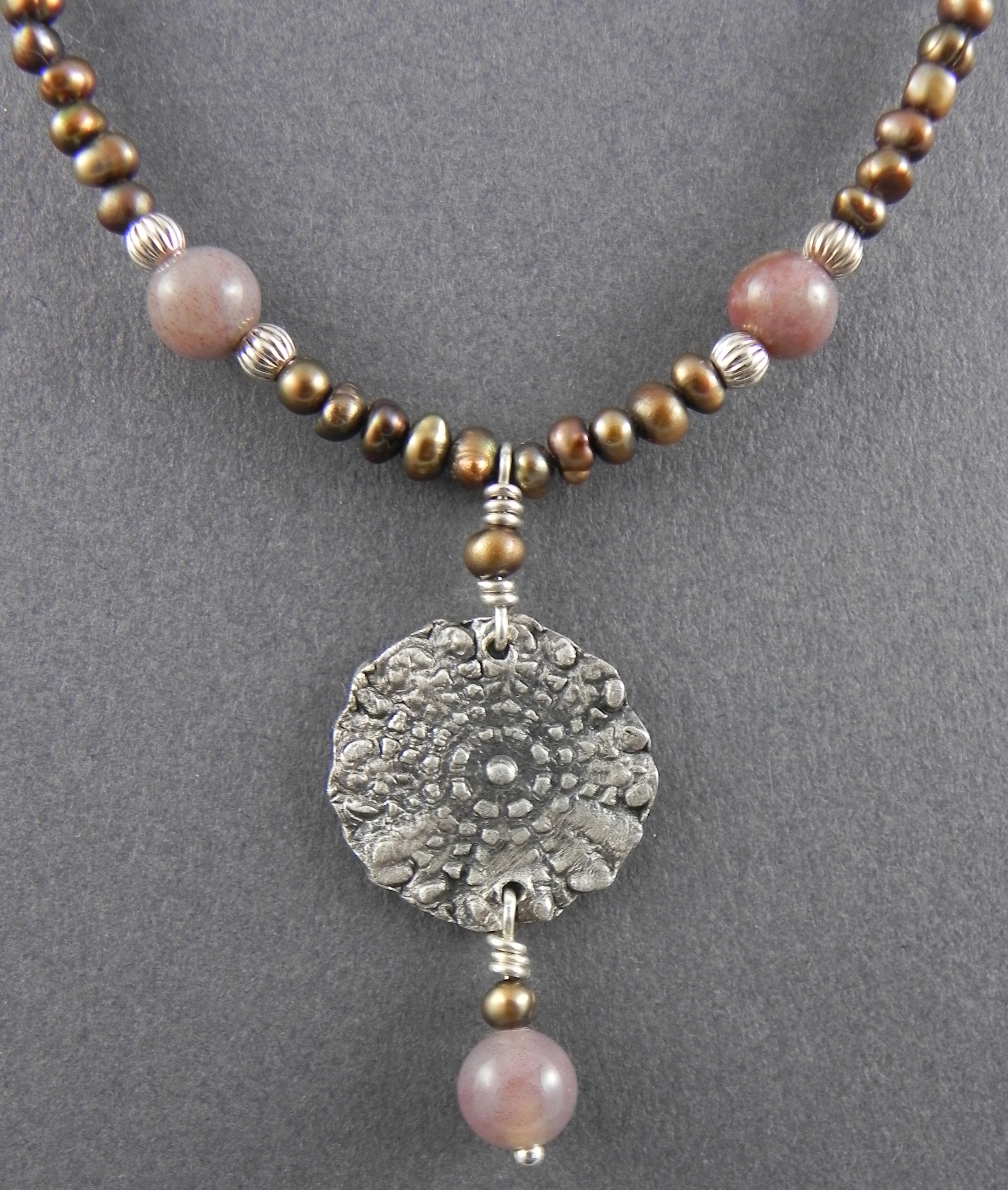 Earthy Coin Bead NCB01 Fine Silver Medallion with Copper Fresh Water Pearls, Fancy Jasper & Sterling Beads $80 Available Length: 16″-18″ (please specify exact size at checkout) Click to share on Facebook (Opens in new window) Facebook Click to email a link to a friend (Opens in new window) Email Click to share on X (Opens in new window) X Like Loading... Related