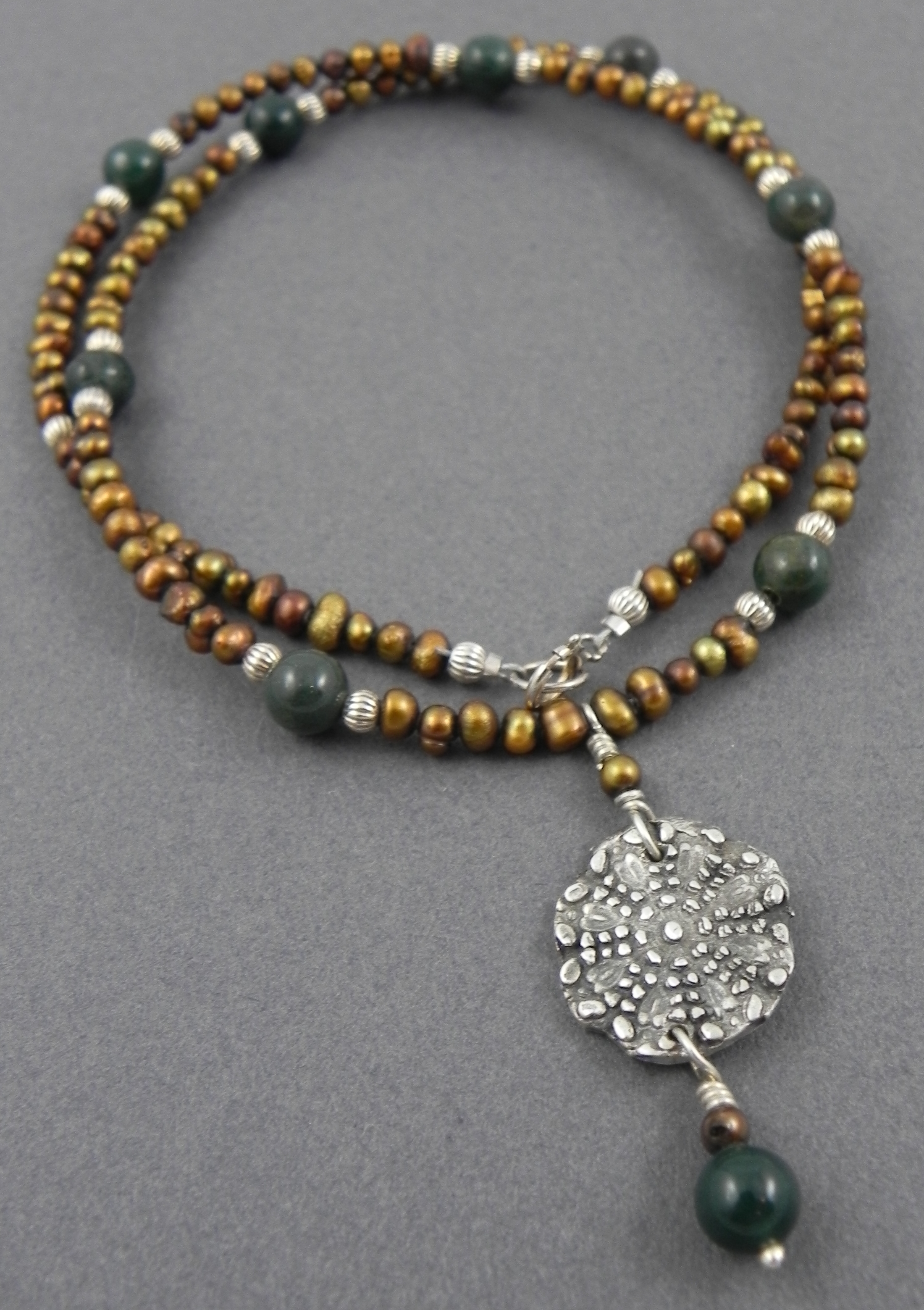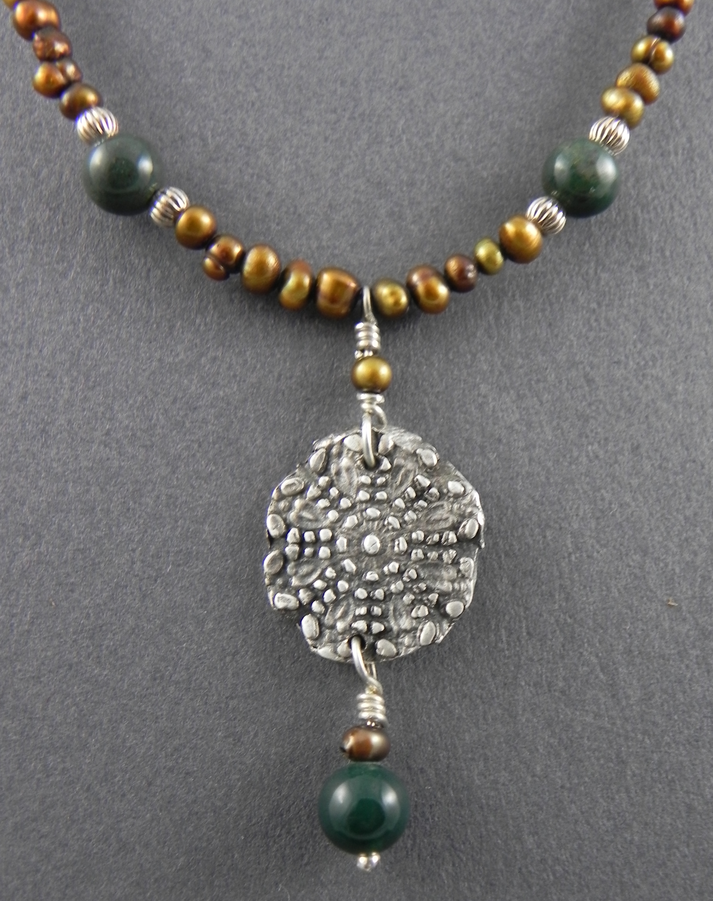 Earthy Green Coin Bead NCB02 Fine Silver Medallion with Copper Fresh Water Pearls, Fancy Jasper & Sterling Beads $80 Available Length: 16″-18″ Click to share on Facebook (Opens in new window) Facebook Click to email a link to a friend (Opens in new window) Email Click to share on X (Opens in new window) X Like Loading... Related