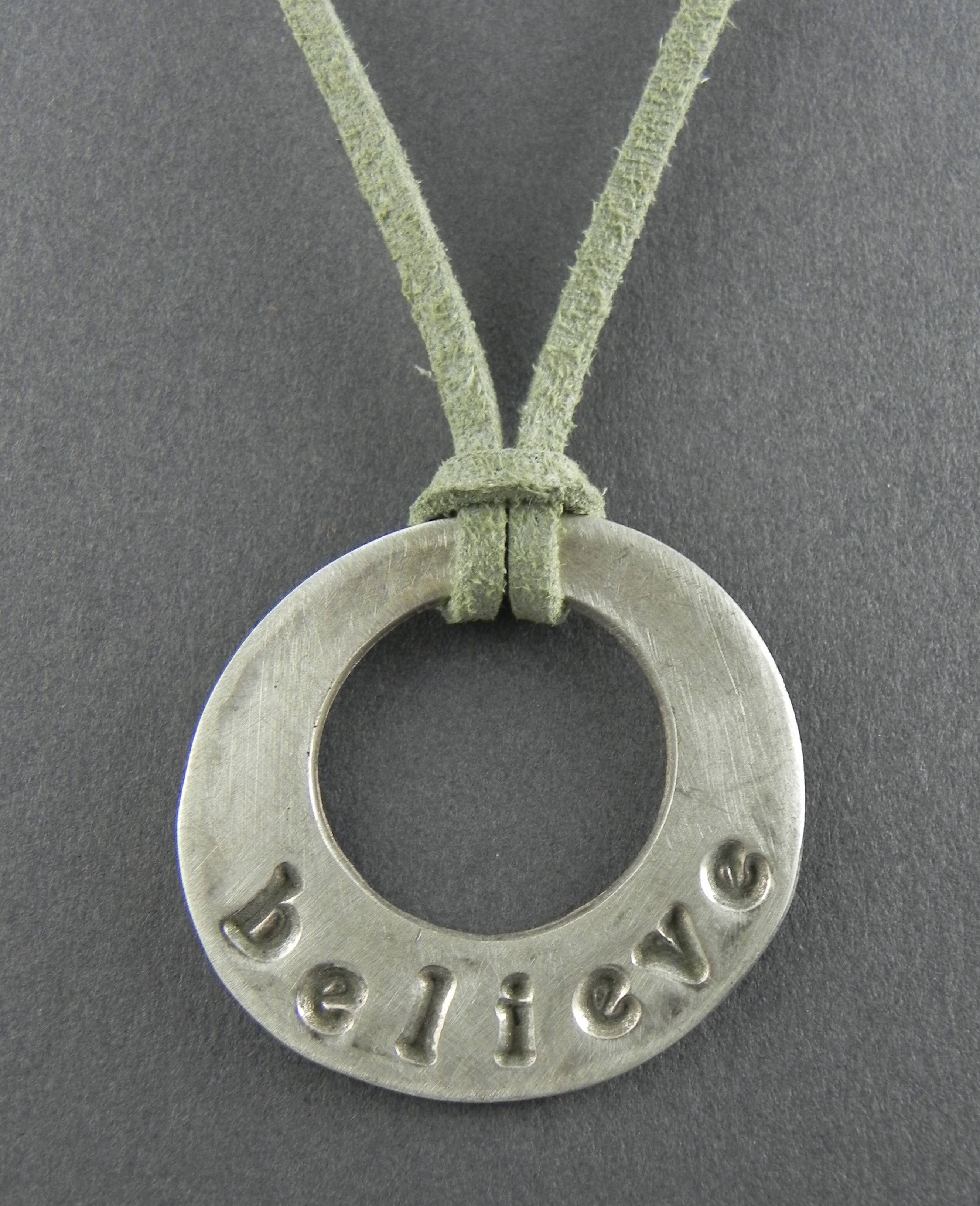 Fine Silver Circle Pendant with “Believe” on Faux Leather Sage Green
