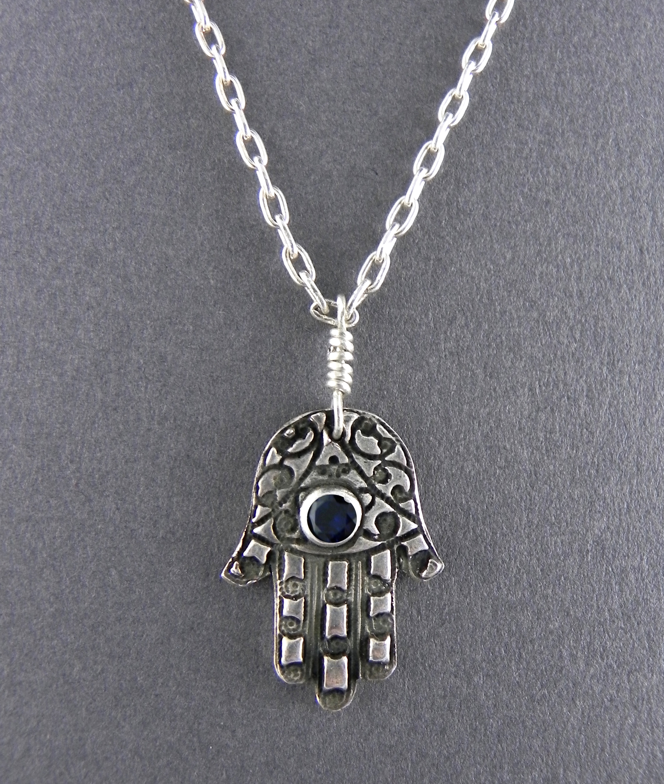 Fine Silver Hamsa w/ Blue Center Cubic Zirconia on Sterling Chain