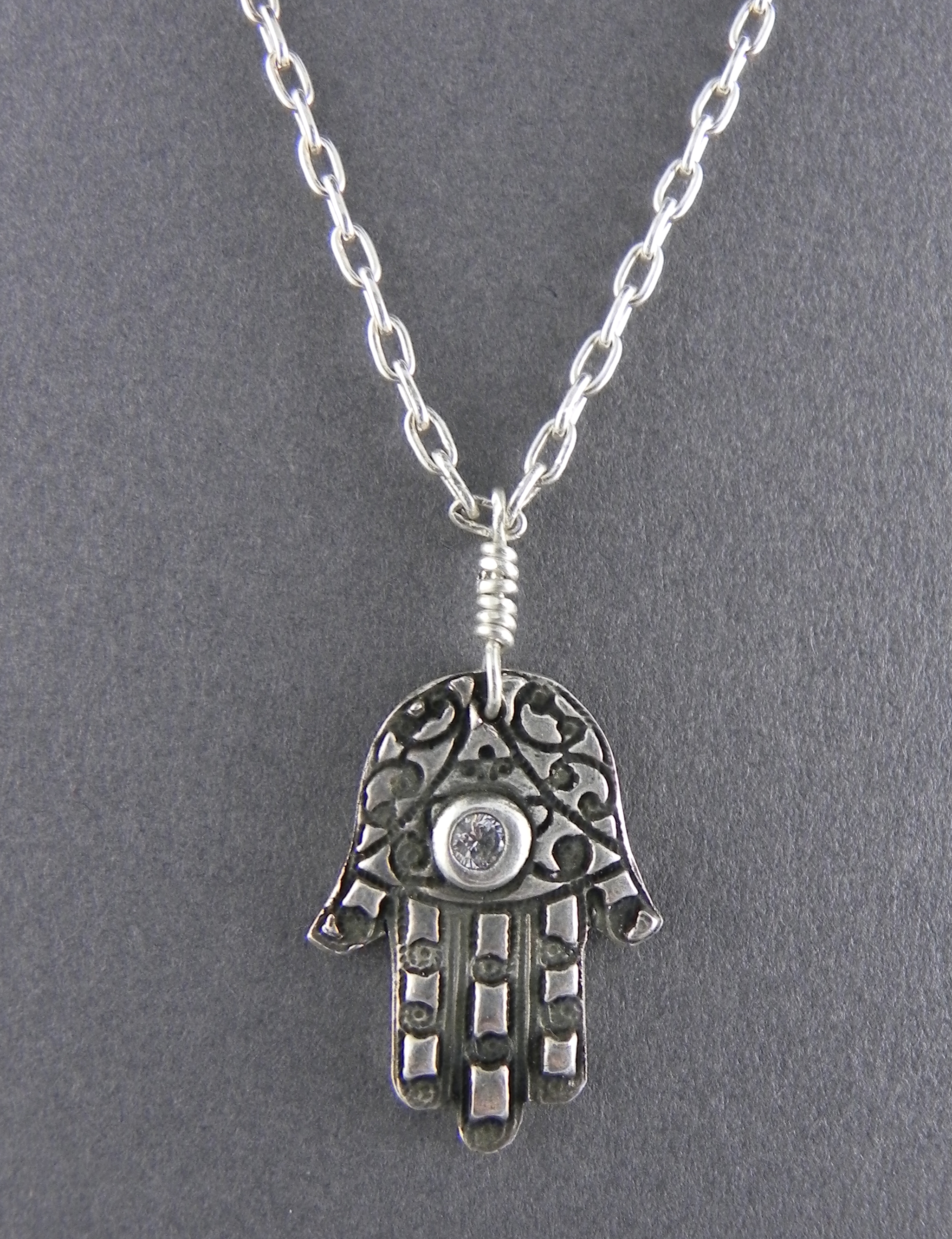Fine Silver Hamsa w/ Clear Center Cubic Zirconia on Sterling Chain
