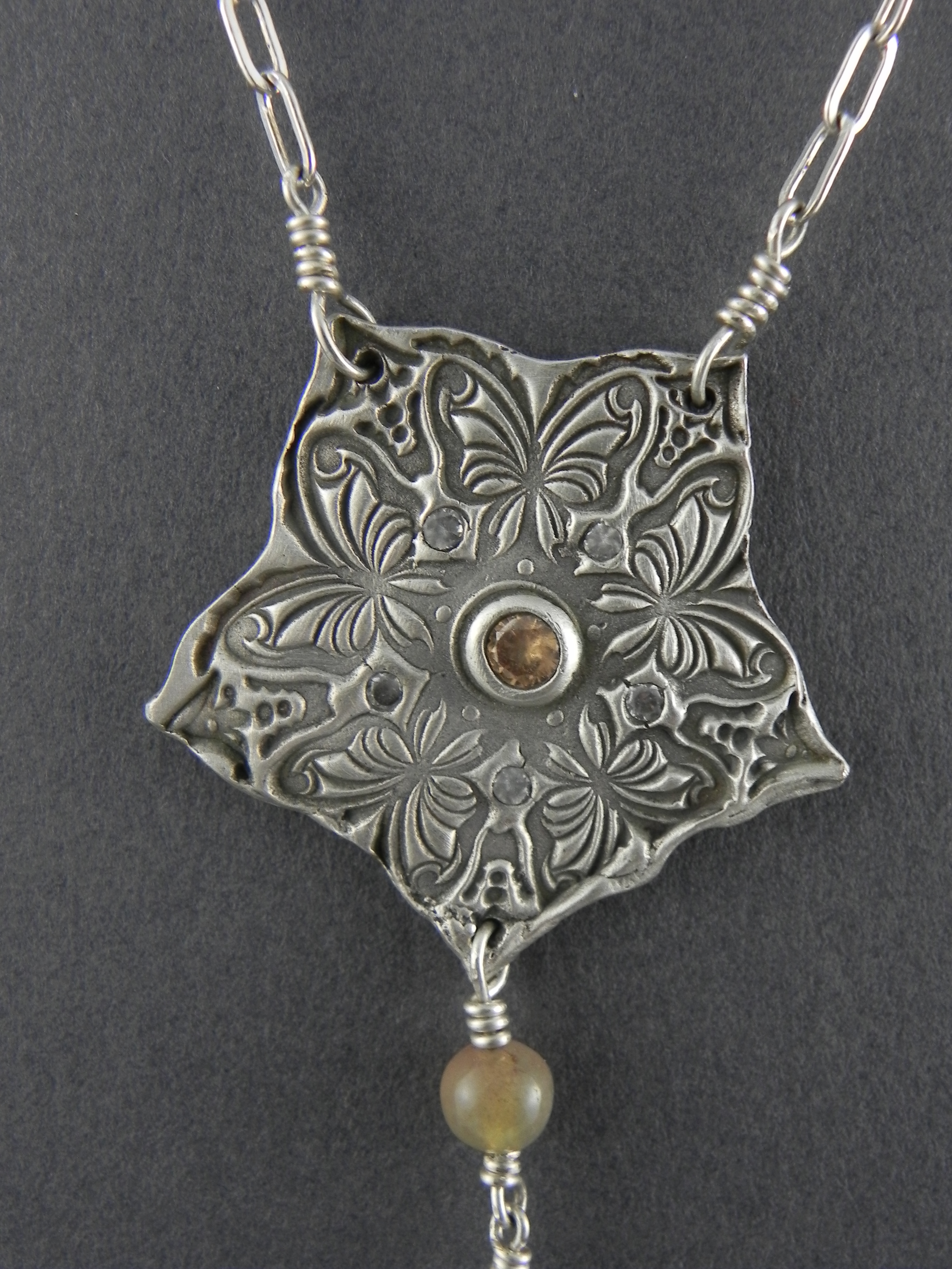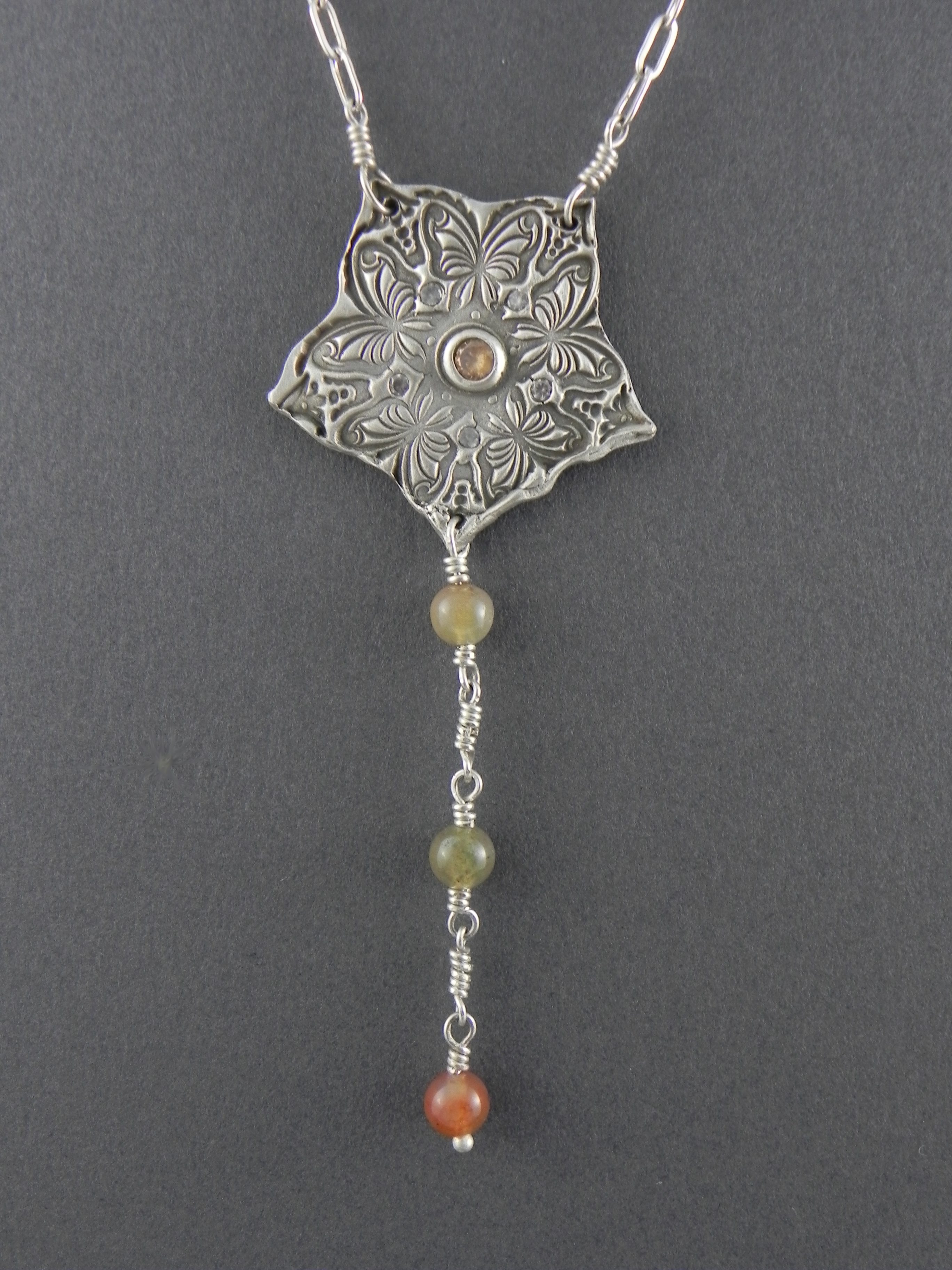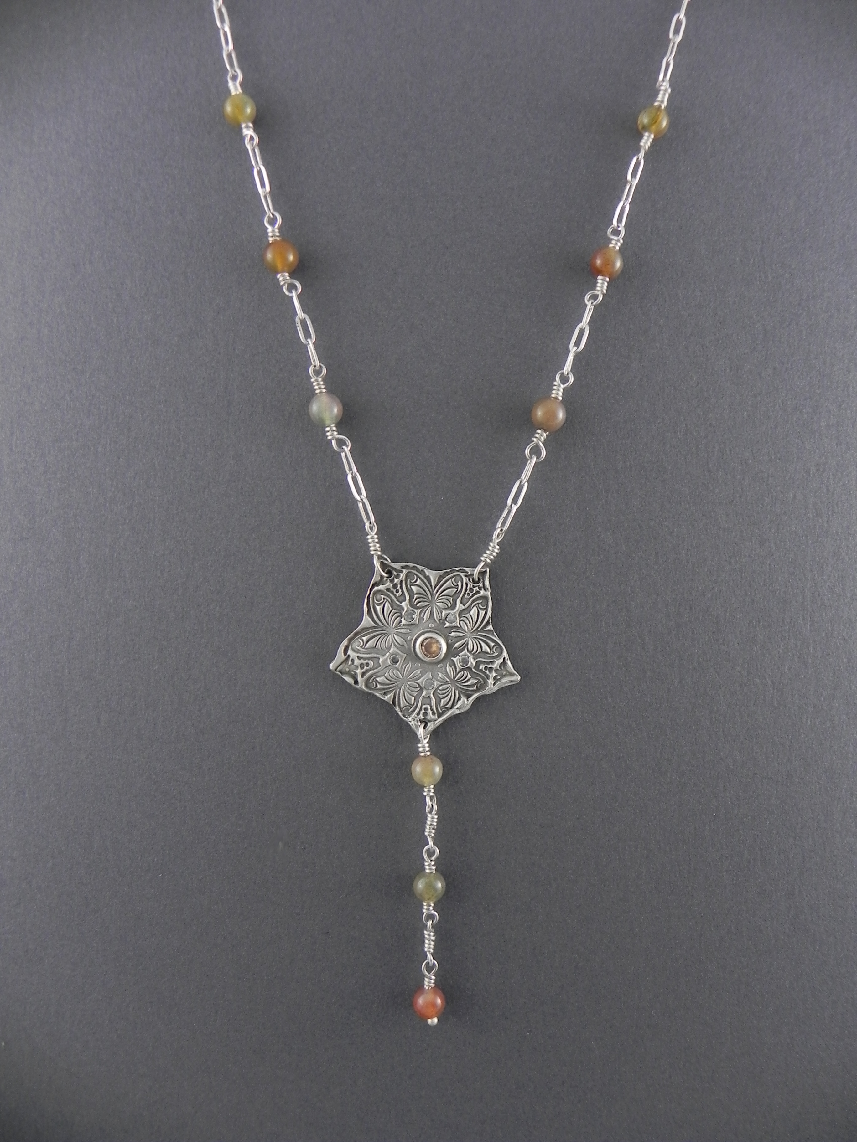Fine Silver Flower with Champagne Pink Cubic Zirconia, wirewrapped onto Sterling Silver chain with Fancy Jaspers