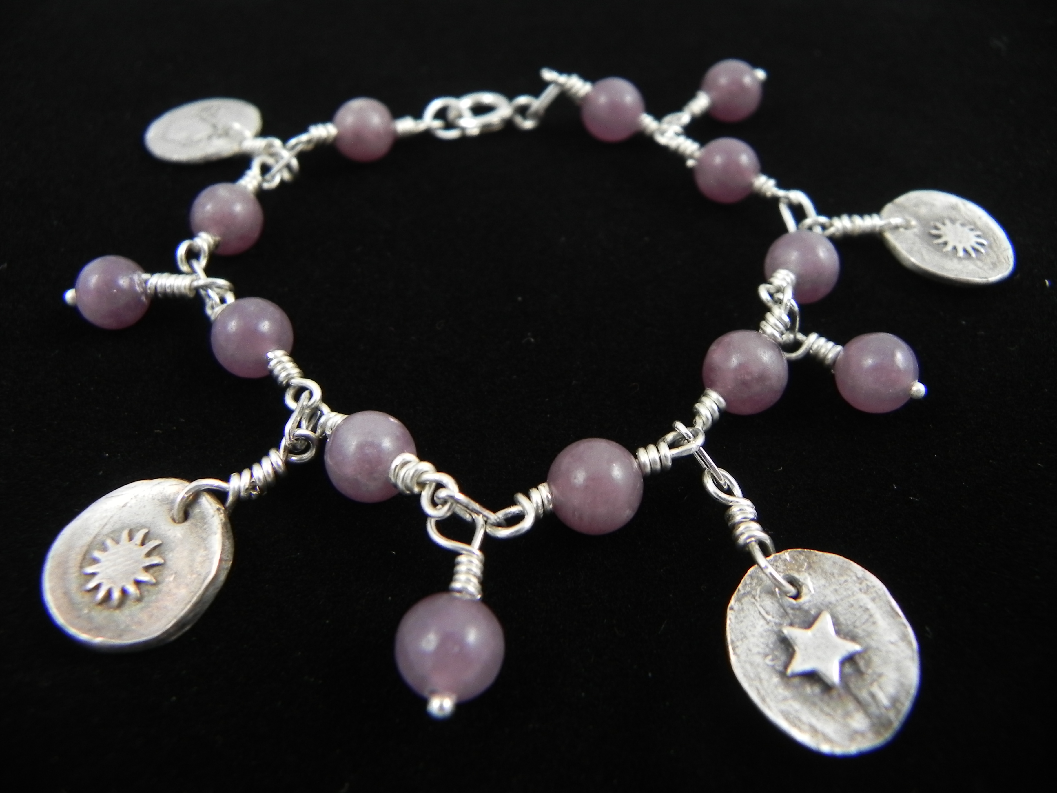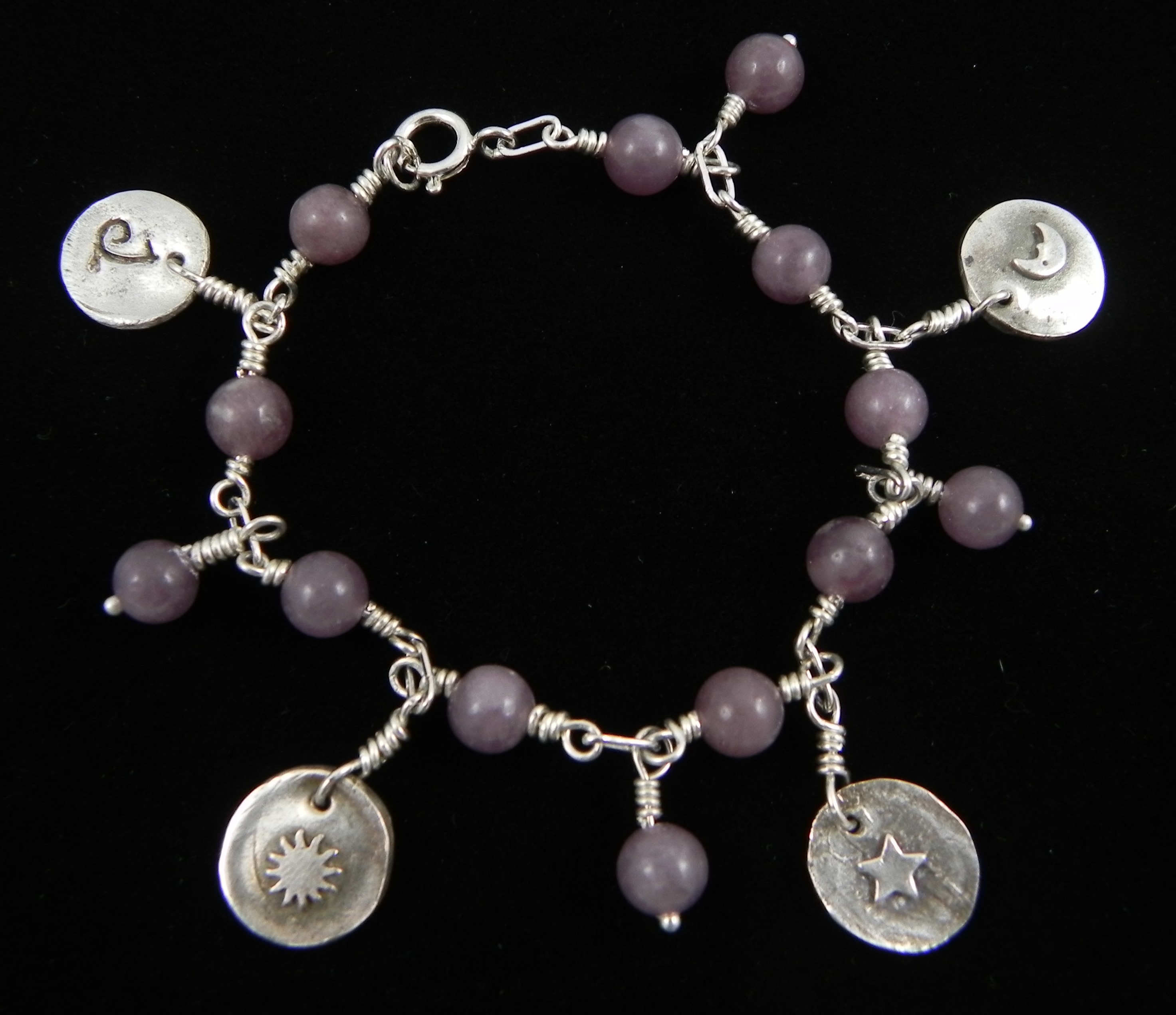 Sun/Moon/Star Lepidolite Bracelet BSML01 Fine Silver Stars & Sun/Moon Reversible Charms, Lepidolite, Sterling Silver $89 Approximate Length: 8″ Click to share on Facebook (Opens in new window) Facebook Click to email a link to a friend (Opens in new window) Email Click to share on X (Opens in new window) X Like Loading... Related