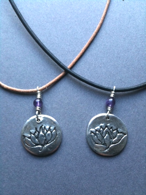 Lotus Amethyst NLA01 Fine Silver lotus pendant & amethyst on 16″ cord (Available cords: natural or black leather, faux leather/suede: tan, brown, black) $58 Click to share on Facebook (Opens in new window) Facebook Click to email a link to a friend (Opens in new window) Email Click to share on X (Opens in new window) X Like Loading... Related